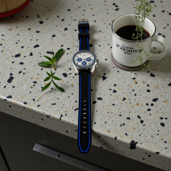 The striking blue and white dial is paired with three functional subdials and a tachymeter bezel, perfect for motorsport enthusiasts who appreciate precision timing. The date window is subtly integrated at 4:30 for added utility without disrupting the sleek dial design.