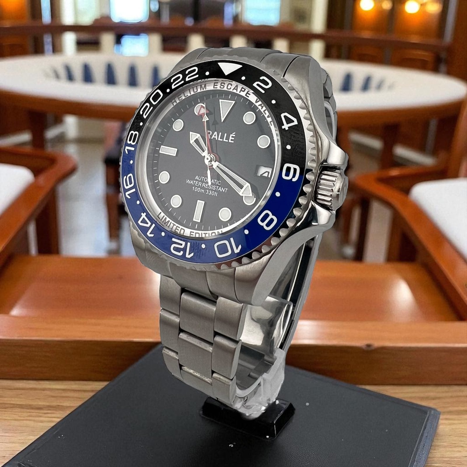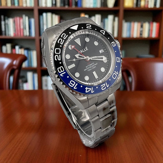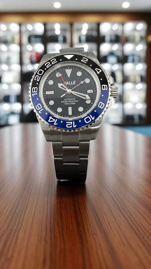 Visually striking, the Horizon features your choice of an iconic blue-and-black “Batman” bezel or an all-black 24-hour bezel, each crafted for legibility and presence. The deep black dial offers a refined backdrop, complemented by luminous hands and markers for clarity in any light.